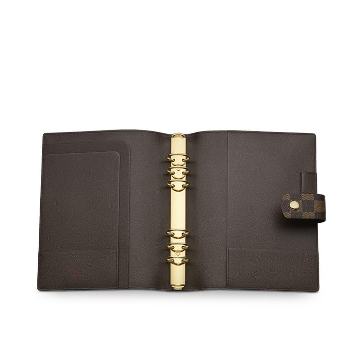 Esta capa para agenda espaçosa possui vários compartimentos, fendas para cartões de crédito e fecho com botão de pressão.
