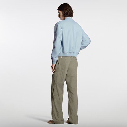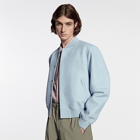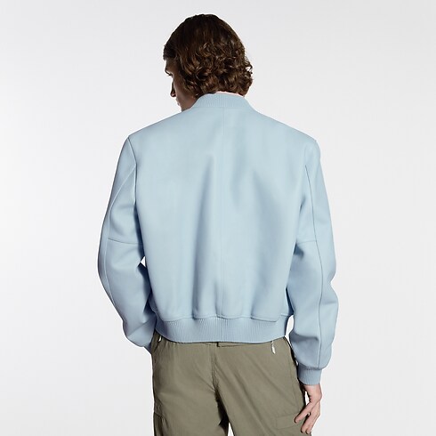 Confeccionada em couro de bezerro azul suave, esta jaqueta traduz a elegância discreta que permeia o desfile Spring-Summer 2026. O couro macio apresenta uma delicada ribana na gola, nos punhos e na cintura, tudo finalizado com uma costura em tom sobre tom. A inscrição Louis Vuitton Paris aparece de forma sutil, estampada no peito, enquanto o forro matelassado em losangos remete ao forro malletage dos baús Louis Vuitton.