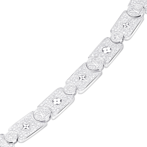 O colar Masterpiece Gourmette é um dos destaques da nova coleção Les Gastons Vuitton, um tributo à visão criativa e personalidade única de Gaston-Louis Vuitton, neto de Louis Vuitton. Os elos de ouro branco são gravados e cortados a laser com o clássico Monogram e valorizados por um deslumbrante pavé de diamantes. Ícones da joalheria e um elegante efeito jateado na parte interna trazem um toque extra de sofisticação.