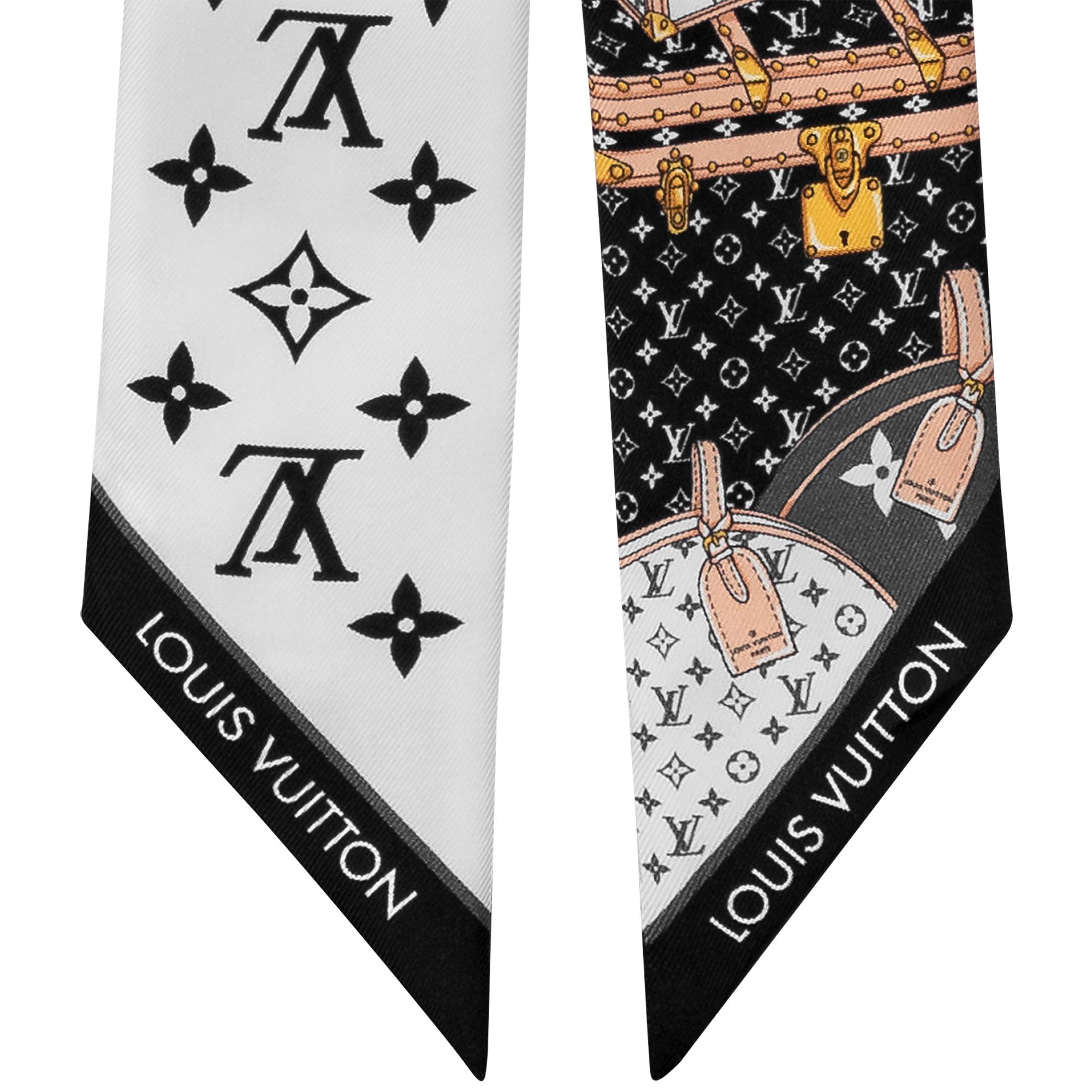 O bandeau Lets Go BB destaca a rica tradição da Louis Vuitton na fabricação de bagagens. De um lado, a peça é estampada com baús coloridos e do outro, homenageia a Maison com o icônico padrão Monogram. Esses grafismos minuciosos são elaborados com uma exclusiva técnica de impressão a jato de tinta aplicada sobre seda pura.
