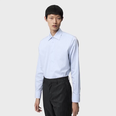 Esta camisa de alfaiataria de manga longa traz a padronagem LV Composition em jacquard de algodão azul suave e brilhante. Uma assinatura LV bordada decora o botão superior. Ela combina com a jaqueta e a calça cigarrete de mesmo estilo, compondo um visual de alfaiataria contemporâneo.