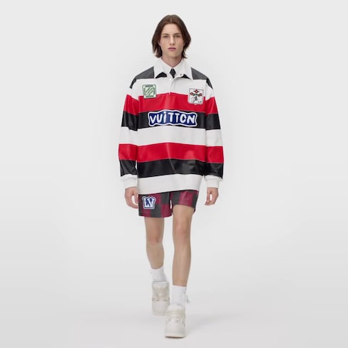Esta camisa de rugby de couro do desfile Spring-Summer 24 reinventa os códigos da moda masculina, trazendo um sofisticado savoir-faire ao universo sportswear. Ela é confeccionada em couro macio de cordeiro em um corte oversized e apresenta ousadas listras horizontais em intarsia, decoradas com assinaturas da Maison em patches bordados. Esta peça combina perfeitamente com o short de couro de mesmo estilo para um look sofisticado.