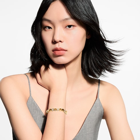 This eye-catching bracelet joins the LV Cube collection, inspired by a puzzle game called Pateki invented by Gaston Vuitton in 1932. Its eye-catching design features gold-toned metal cubes recalling the iconic Damier checkboard pattern, enlivened with sparkling rhinestones and Louis Vuitton Paris signature engraving. A playfully elegant bracelet, and a tribute to the House’s creative heritage.