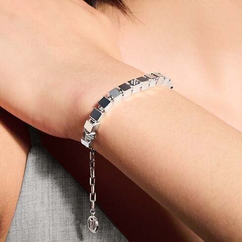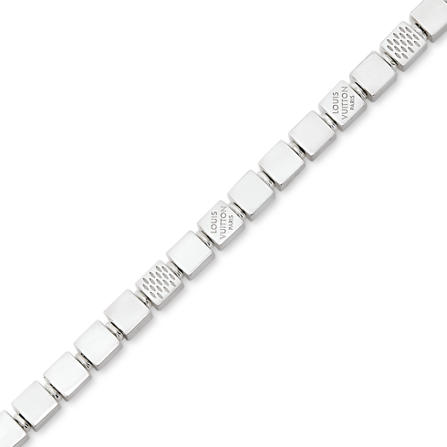 Crafted in sterling silver, the LV Cube bracelet was inspired by the classic Damier canvas and Pateki, a puzzle game devised by Gaston Vuitton in 1932. Its cube-shaped chain links are delicately engraved with canvas-like textures and the Louis Vuitton Paris signature for an original House touch. This distinctive bracelet enhances any outfit with an aura of playful elegance.