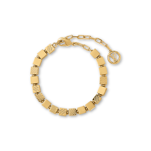 Finely crafted in gold-colored metal, the LV Cube bracelet was inspired by the heritage Damier pattern and a puzzle game called Pateki, designed by Gaston Vuitton in 1932. Its delicately linked cubes are engraved with Damier canvas-style stripes and the Louis Vuitton Paris signature for an extra House touch. Perfect for adding a glint of playful elegance to any look.