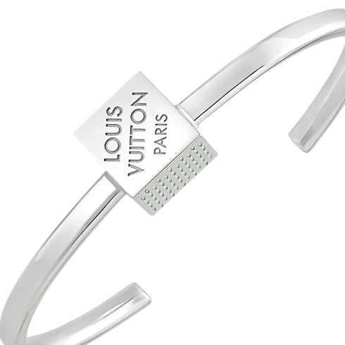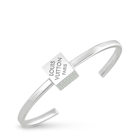 The sterling silver LV Cube rigid bracelet was inspired by a puzzle game called Pateki designed by Gaston Vuitton in 1932. Its centerpiece is a finely crafted cube engraved with stripes and a Louis Vuitton Paris signature, echoing the look of the House’s emblematic Damier canvas. An original bracelet with a distinctive aura of playful elegance.