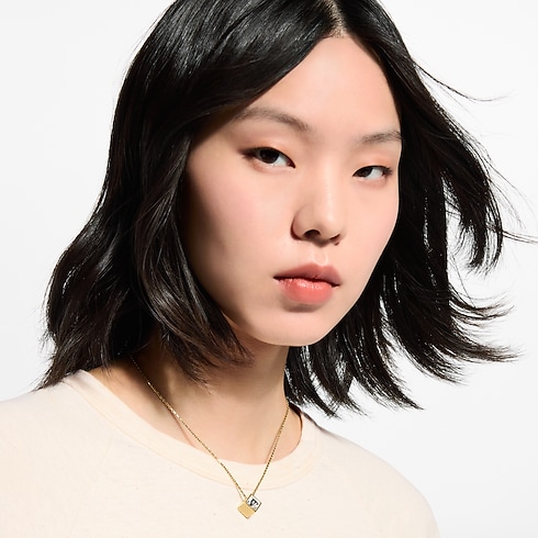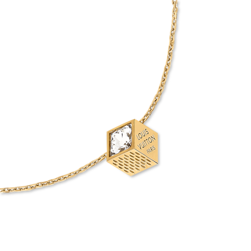 A puzzle game called Pateki, invented by Gaston Vuitton in 1932, gets a contemporary update in the playful design of the LV Cube necklace. Its centerpiece is a gold-colored metal cube with Damier canvas-style engraving, accented with a radiant rhinestone. A Louis Vuitton Paris signature adds an extra House flourish to this fun, enchanting necklace.