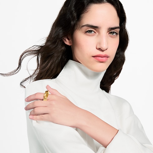 The angular forms of Pateki, a puzzle game devised by Gaston Vuitton in 1932, are brought to life in the playfully elegant LV Cube ring. Three gold-colored metal cubes are delicately engraved with stripes recalling the look of the iconic Damier canvas. The Louis Vuitton Paris signature adds a finishing House touch to this finely crafted, enchanting ring.