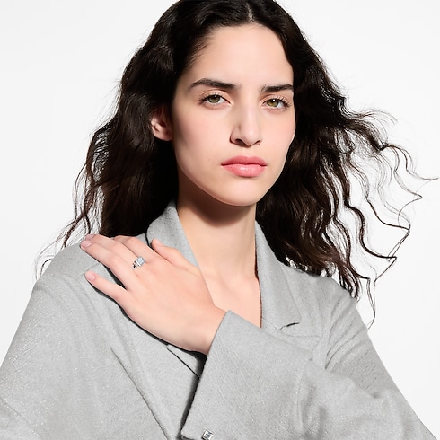 This exceptional sterling silver ring joins the LV Cube collection, inspired by a puzzle game called Pateki invented by Gaston Vuitton in 1932. Its centerpiece is a cube elegantly engraved with a Louis Vuitton Paris signature and delicate stripes recalling the look of the House’s historic Damier canvas. Perfect for adding an eye-catching glint of sophistication to any outfit.