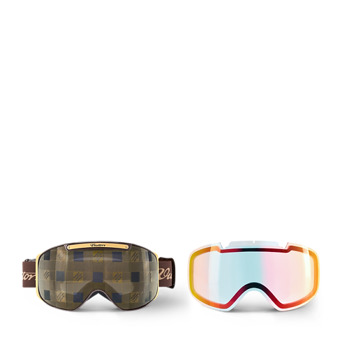 A máscara de esqui LV Summit mescla características tecnológicas ao savoir-faire artesanal que a Louis Vuitton valoriza há anos. As lentes são cobertas pela padronagem Damier e trazem detalhes de metal brilhante que evidenciam a expertise da marca na confecção de baús. A tira confortável apresenta a assinatura "Vuitton" manuscrita.