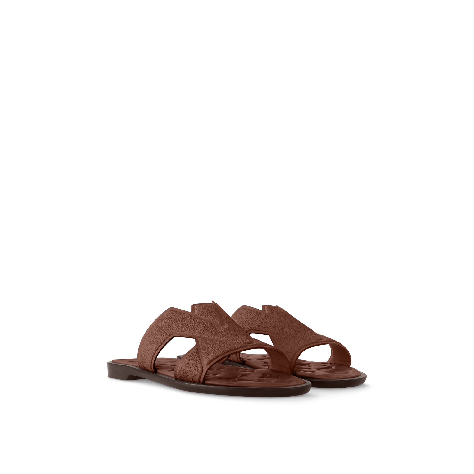 Feito em couro de vitelo granulado macio, o chinelo LV Oasis é marcado pelo padrão LV entrelaçado sobre o cabedal. Esse modelo conta com uma confortável palmilha em couro, gravada com o icônico padrão Monogram da Maison. Ele é finalizado com solado em couro flexível com detalhes em borracha.