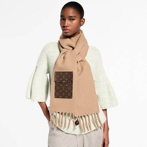 The LV On My Way scarf redefines contemporary elegance with an imaginative blend of style and functional versatility. Crafted in plush wool, it features a Monogram pocket with a snap closure for an original House signature. This trendy yet timeless scarf offers warmth and comfort, plus a clever way to keep small personal items close at hand.