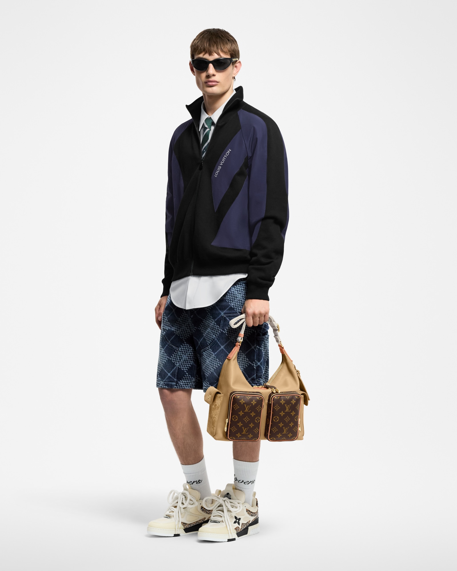 Esta versão elaborada do tênis LV Skate vem em malha tecnológica e couro de vitelo com pelos, decorado com pequenos spikes. Remetendo aos tênis de skate dos anos 90, este modelo tem cano e lingueta acolchoados e exagerados. Os principais detalhes são uma Flor do Monogram na lateral e a assinatura Vuitton since 1854 na parte de trás.