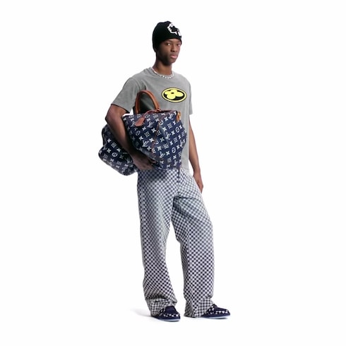 O tênis LV Trainer é revisitado em jeans Damier, um elemento-chave do desfile masculino Fall-Winter 2025. O cabedal de construção complexa, inspirado nos tênis de basquete vintage, é confeccionado com mais de 80 peças. Detalhes exclusivos incluem a assinatura Louis Vuitton manuscrita na lateral e uma Flor do Monogram no solado emborrachado tecnológico.