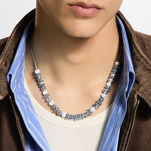 O colar LV Whisper Beads é uma peça sofisticada e ousada que exalta os ícones da Maison e referências globais. Confeccionado em prata de lei, o fio texturizado apresenta Flores do Monogram e as Iniciais da Maison, delicadamente gravadas em diversas modelagens esculturais. As contas com efeito guilloché celebram o savoir-faire artesanal indiano.