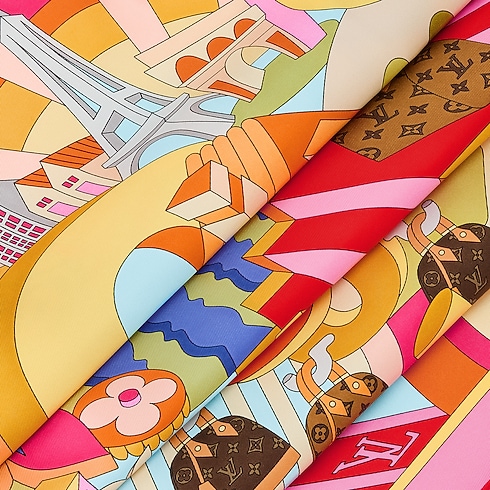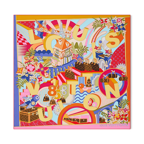 Innovation meets imagination in the artistic pattern of the LV Wonderland square. Printed on sumptuous silk, it depicts a playful, futuristic landscape of blooming Monogram Flowers combined with iconic Louis Vuitton trunks and bags, plus a House signature in dynamic 3D-effect lettering. With its radiant colors and eye-catching contrasts, this versatile accessory makes a bold creative statement.