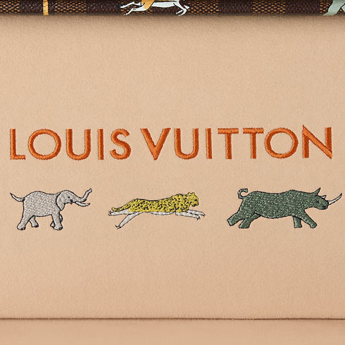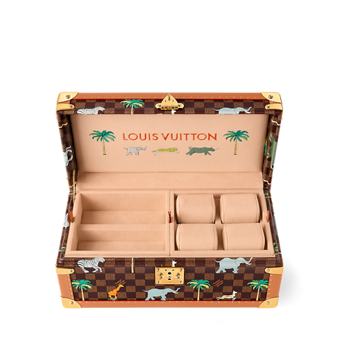 O coffret LV x The Darjeeling Limited Coffret Accessoires é confeccionado em canvas Damier Ebene Heritage, enriquecido com animais vibrantes e palmeiras em um estilo que remete ao filme. Projetado para acomodar óculos de sol, relógios, cintos e joias, conta com almofadas removíveis e diversos compartimentos. A tampa interna é bordada com padronagens de animais.