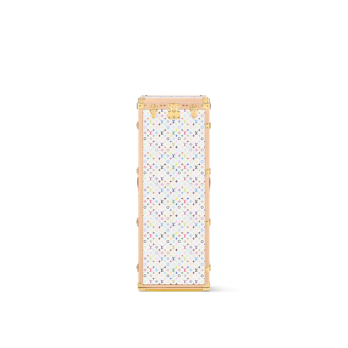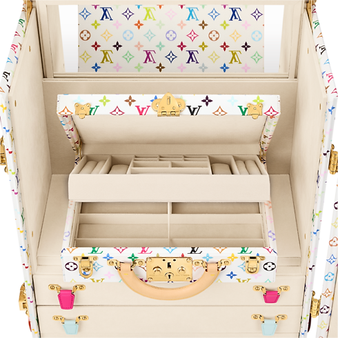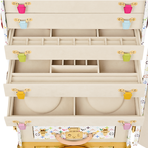 Ideal para armazenar, transportar e exibir alta joalheria, a sofisticada Malle Vendôme ganha um toque alegremente contemporâneo no canvas Monogram Multicolore de Takashi Murakami. Forrada em microfibra e matelassada na tampa, seu interior suntuoso apresenta busto para colar, gavetas, caixas de exposição, espelho, nécessaire nômade e uma Boîte Bijoux que desliza para uso separado.