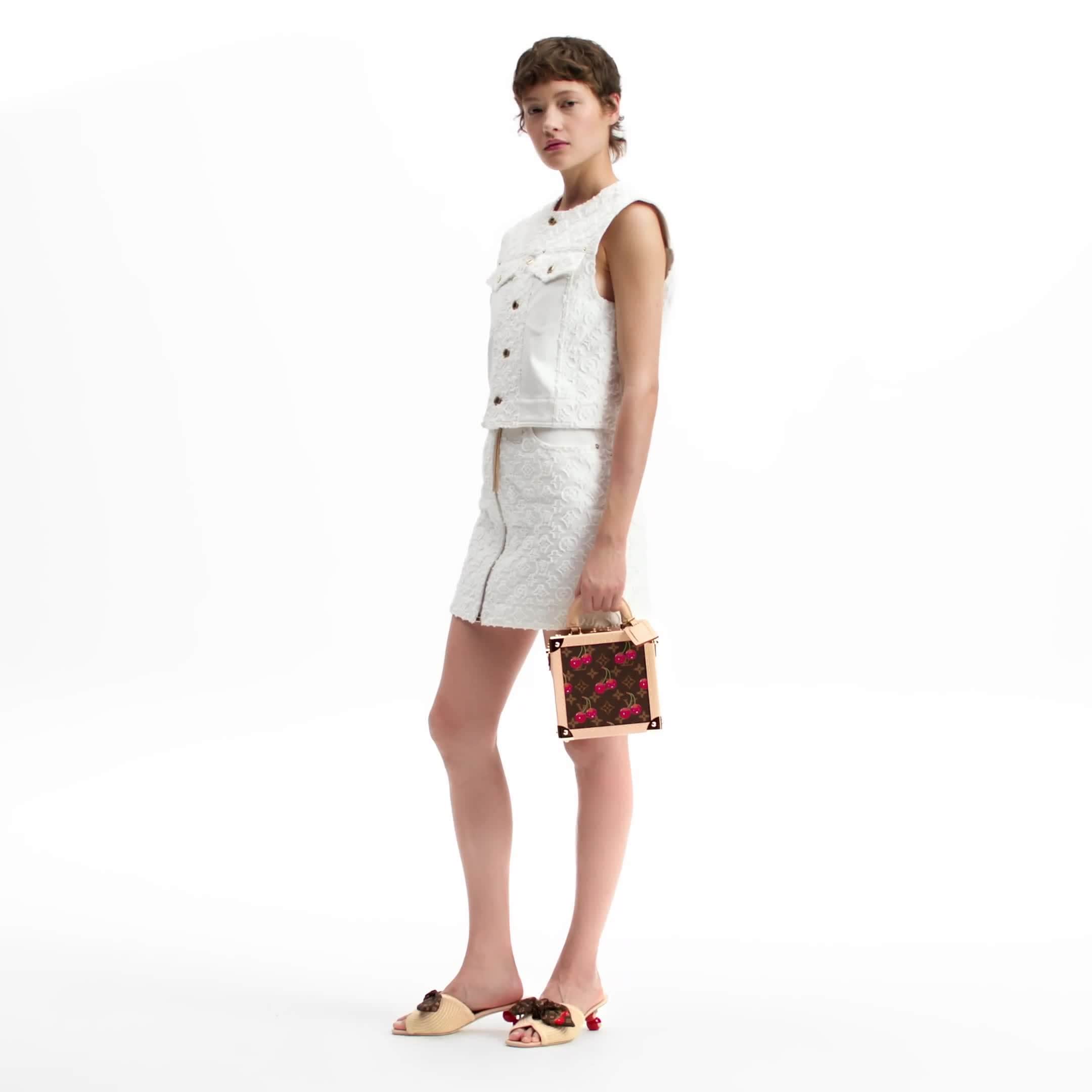 Com símbolos tradicionais da Maison em proporções divertidas, a mini bolsa Square Trunk traz cerejas sobre o clássico canvas Monogram, apresentando um padrão kawaii como parte da segunda edição da coleção Louis Vuitton x Takashi Murakami. As bordas em couro natural são finalizadas com ferragens douradas brilhantes, incluindo rebites nos cantos. Uma alça superior curva e outra removível oferecem diferentes opções de uso.