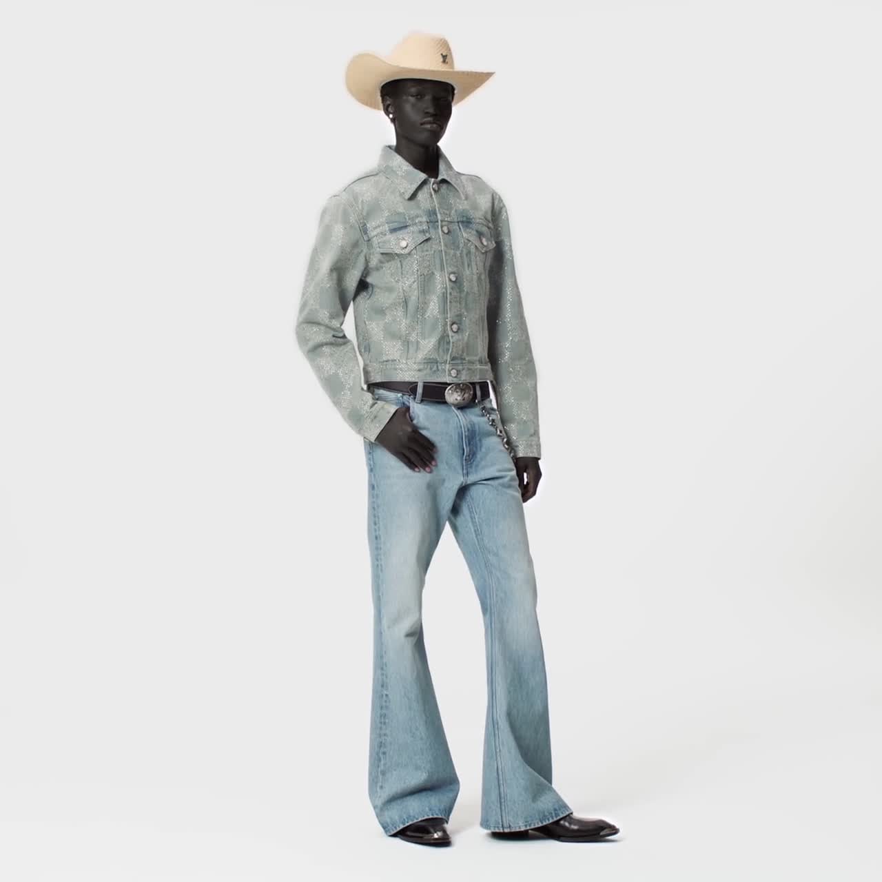 Esta jaqueta jeans feita sob encomenda dá um toque de brilho aos looks de inspiração Western dândi do desfile Fall-Winter 24. O modelo clássico é confeccionado em jacquard Damier estonado e realçado com cristais meticulosamente aplicados. Assinaturas 'Marque L. Vuitton déposée' e botões com efeito perolado conferem sofisticação a esta peça, que se destaca tanto de dia como de noite.