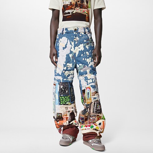 Esta calça marcante traz o emblemático símbolo LV Teen Bedroom do desfile Fall-Winter 23. Com corte baggy, a peça feita sob encomenda é delicadamente bordada para representar o quarto de um adolescente, onde diversas assinaturas da Maison foram incluídas de forma descontraída. O modelo combina perfeitamente com a jaqueta no mesmo estilo para criar um look marcante.