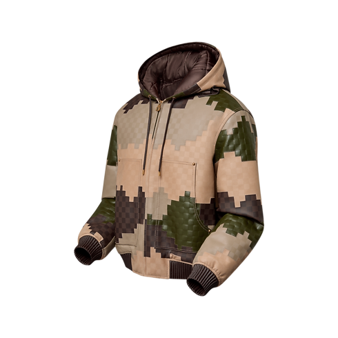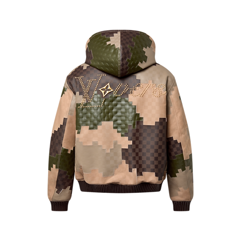 Esta jaqueta de couro com capuz feita sob encomenda traz uma versão elegante da padronagem Damoflage vista no desfile Spring-Summer 24. Combinando tecnologia de ponta com o savoir-faire histórico da Maison, o modelo é confeccionado à mão com mais de 80 peças de couro. Spikes dourados nas costas formam a assinatura LV Lovers apresentada por Pharrell Williams.
