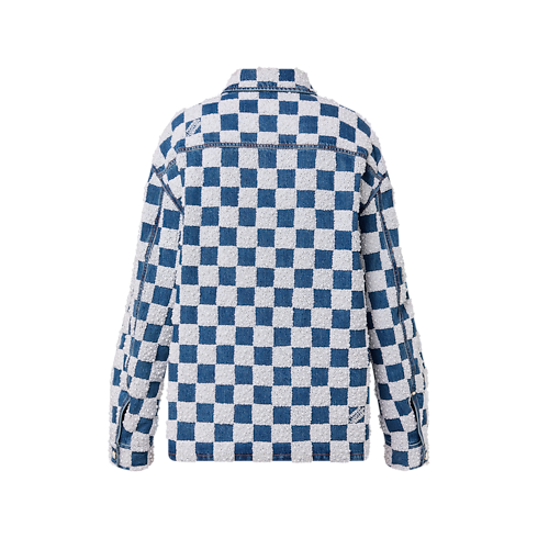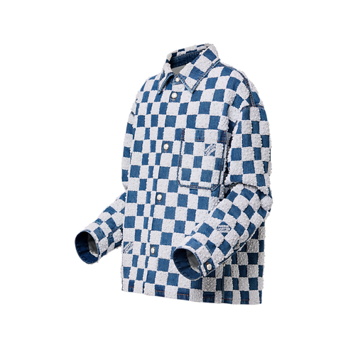 Esta camisa jeans feita sob encomenda e apresentada no desfile Spring-Summer 24 traz pérolas de vários tamanhos bordadas à mão formando o padrão Damier. O contraste entre a silhueta casual e o bordado excepcional tornam este um dos modelos icônicos do desfile de Pharrell Williams.