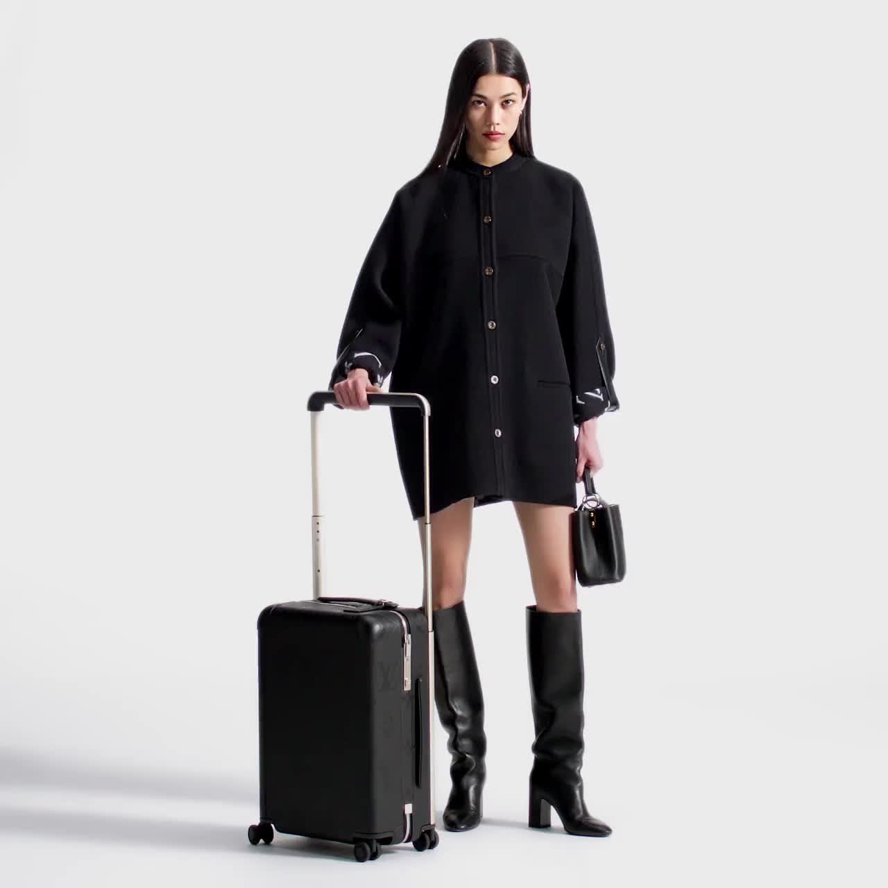 A mala Horizon vem em um suntuoso couro preto macio com uma versão oversized do icônico padrão Monogram da Louis Vuitton em alto-relevo. Compacta o suficiente para ser usada como mala de bordo, ela é fácil de carregar graças às quatro rodinhas duplas e à haste extralarga. Uma mala de viagem prática e feminina com um visual exclusivo e discreto.