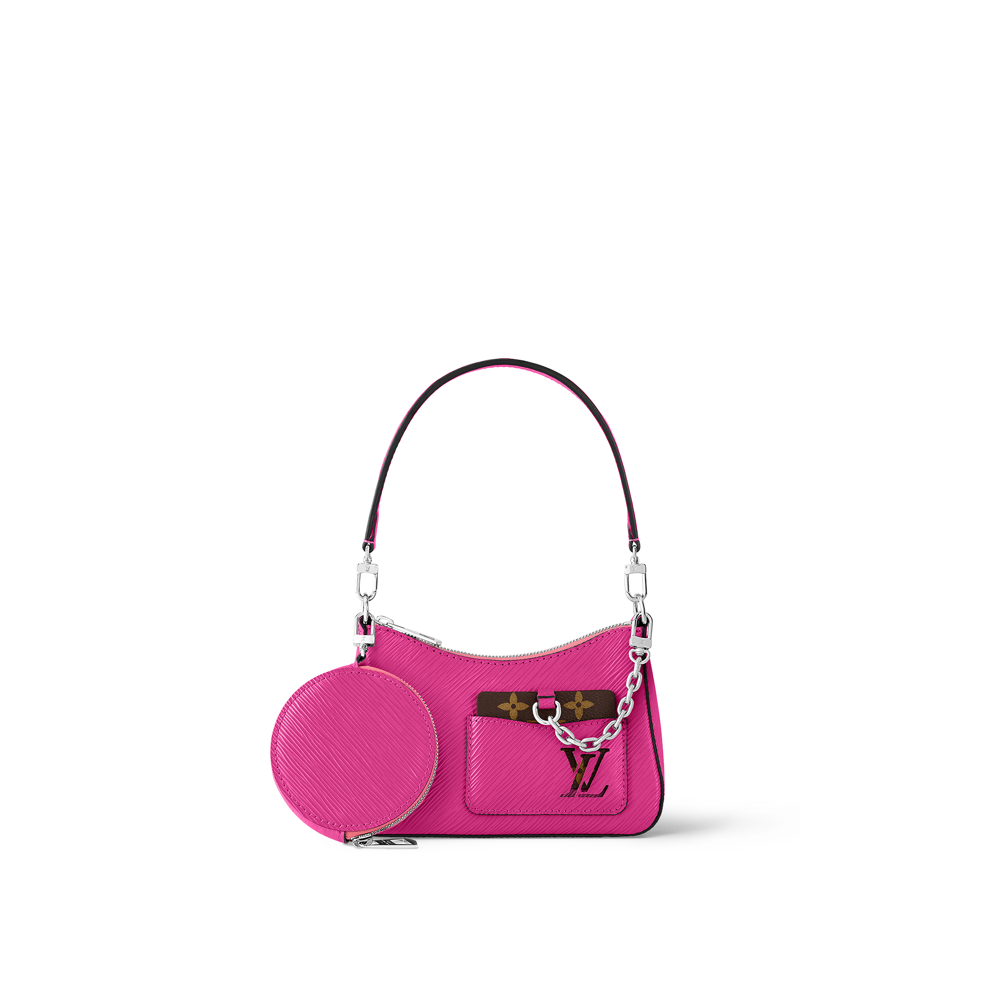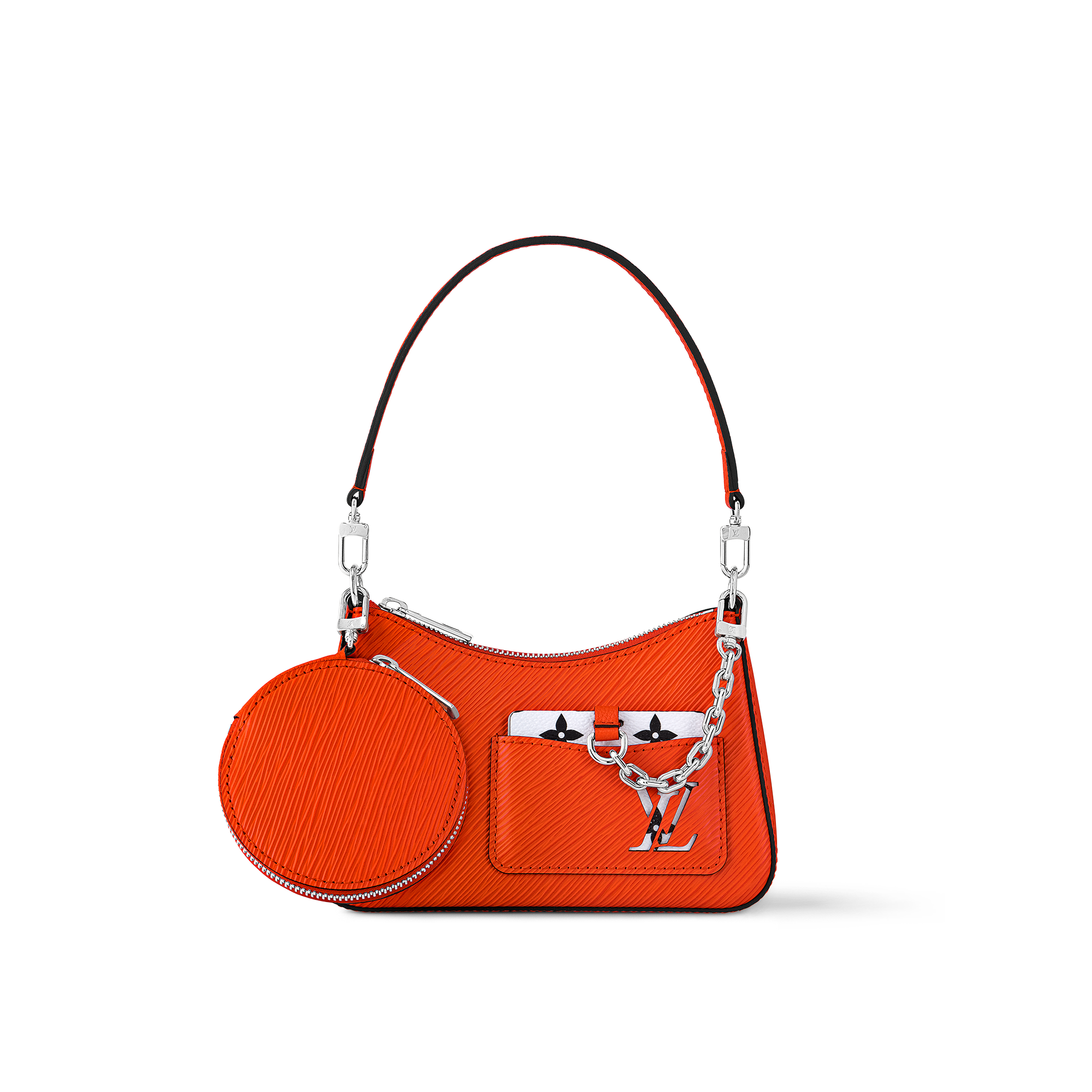 A bolsa Marellini compartilha os detalhes esportivos e elegantes do modelo maior da Marelle, mas em um charmoso formato mini. Confeccionado no clássico couro Epi da Maison, este acessório divertido e versátil acompanha um porta-moedas redondo removível, além de um espelho pequeno, que vem preso à bolsa por uma elegante corrente prateada e pode ser guardado no bolso frontal.