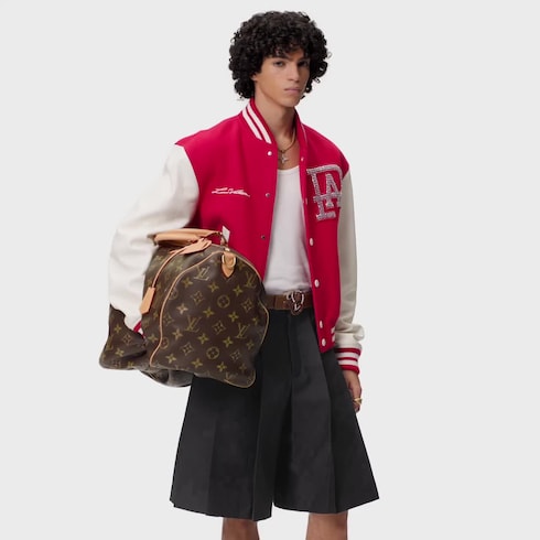 A tradição americana encontra o savoir-faire da Louis Vuitton nesta vibrante jaqueta varsity vermelha. O modelo é inspirado na época em que Pharrell Williams era membro da bateria da escola Princess Anne, na Virgínia. Esta peça icônica do desfile Spring-Summer 24 apresenta um Damier em tom sobre tom em relevo nas mangas de couro de vitelo branco, um logo Louis Vuitton bordado com pérolas atrás e um patch PA bordado com cristais no peito.