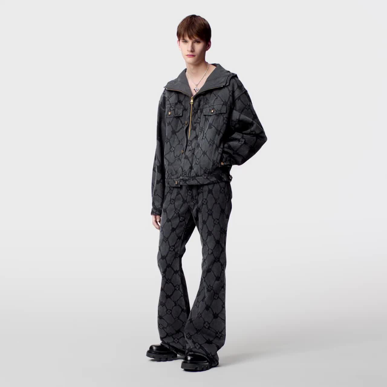 Esta calça flare preta em jeans se destaca com a estampa Monogram Fishnet, que apresenta detalhes de Flores do Monogram. O desenho irregular lembra distorções líquidas, trazendo uma vibe gráfica a este modelo casual. Já o fecho com botão dourado remete às inspirações náuticas da coleção. A peça combina com a jaqueta da mesma linha, criando um look total contemporâneo.