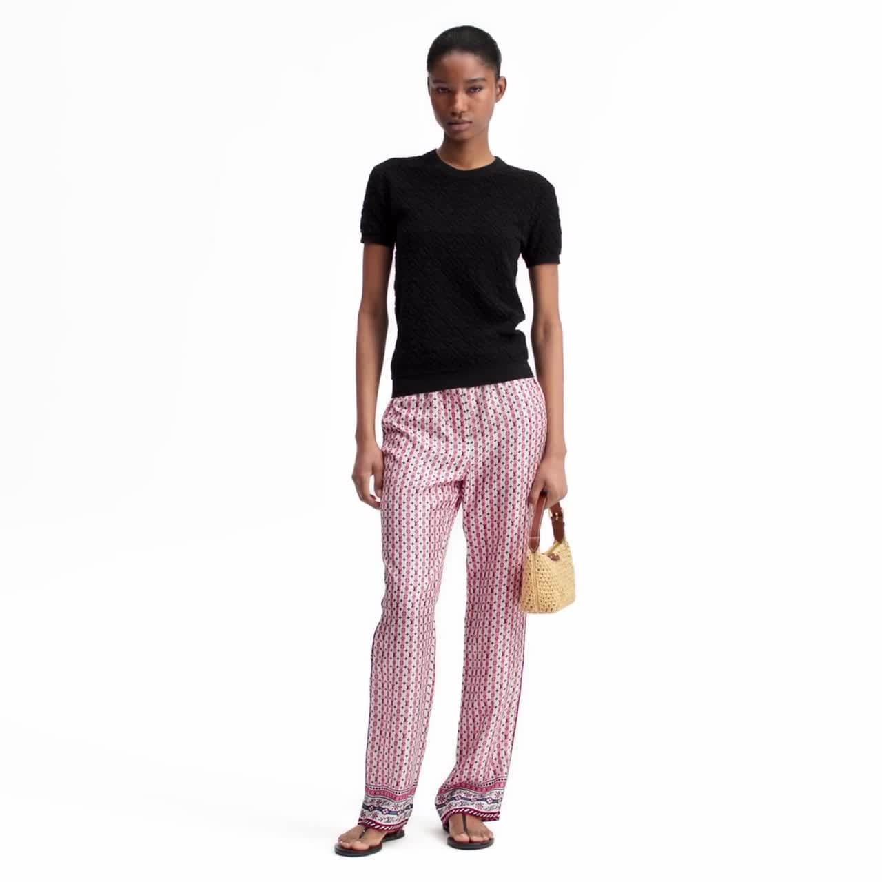 Reinventada em um estilo descontraído com um acabamento atoalhado, esta blusa é confeccionada em mescla macia de algodão e lã. O modelo é discretamente assinado com as icônicas Flores do Monogram da Maison em relevo e complementado com uma gola redonda, mangas curtas e bainhas com ribana esportiva.