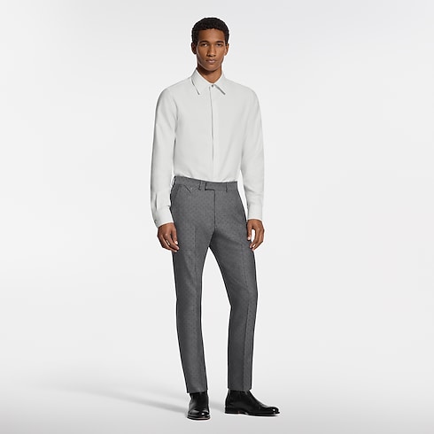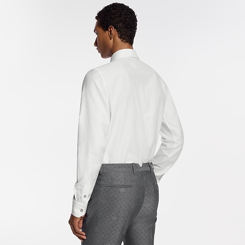 Esta elegante camisa branca para a noite é confeccionada em algodão orgânico de alta qualidade. A silhueta minimalista com botões ocultos é valorizada pelo Monogram Mini Spaced em jacquard tom sobre tom. Um botão LV fecha o colarinho, enquanto uma etiqueta exclusiva tom sobre tom assina a carcela. Esta peça sofisticada pode ser usada com um terno na mesma padronagem.