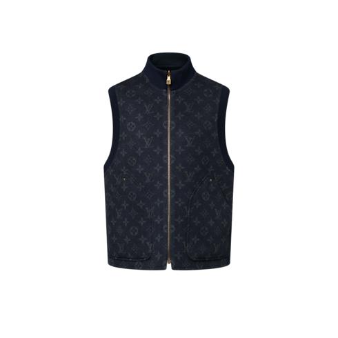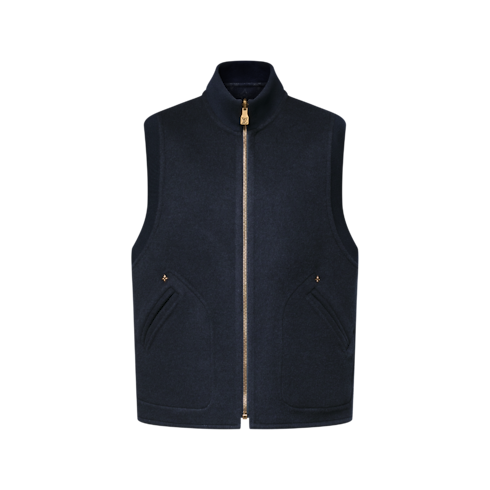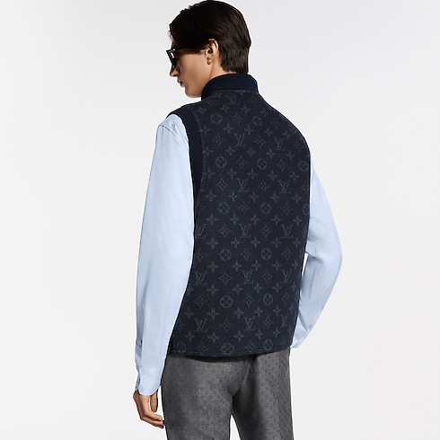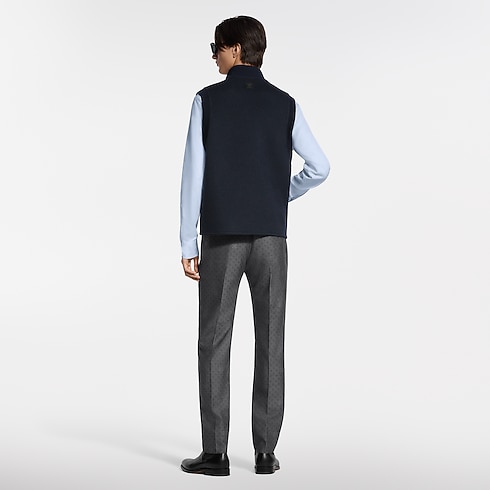 Este colete azul navy reversível é perfeito para a meia-estação, podendo ser usado sobre uma camisa ou pulôver, ou sob uma jaqueta. Confeccionado em tecido dupla face em uma mescla refinada e quente de lã, cashmere e seda, apresenta um lado liso atemporal, decorado com discretos cristais no peito, rebites LV Flower nos bolsos e um patch de couro nas costas, enquanto uma padronagem Monogram em jacquard tom sobre tom confere um toque artístico ao lado avesso.