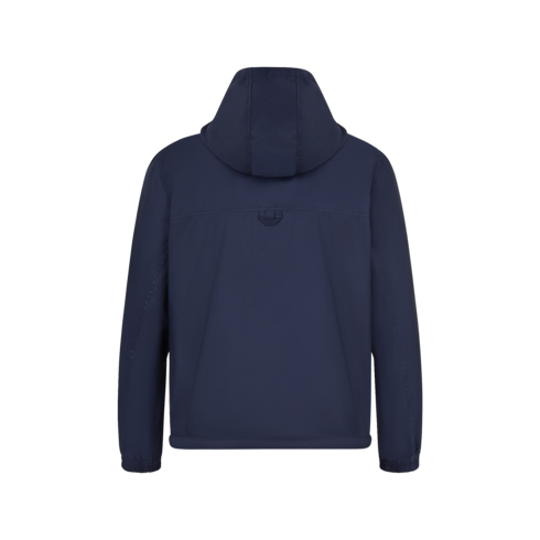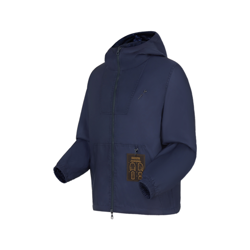 Available in seasonal blue, this reversible piece has a sporty, active vibe. Cut from technical fabric in a regular fit with kimono-style sleeves, it offers a choice between plain and all-over Monogram sides. The chest is adorned with a new seasonal signature: an engraved gold pin, inspired by office supplies.