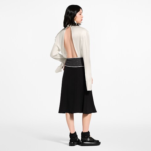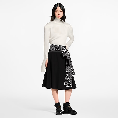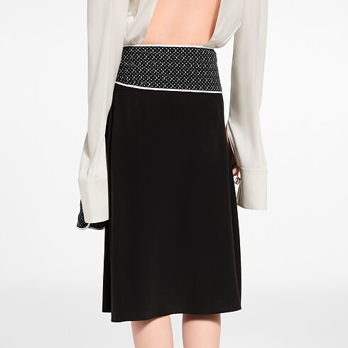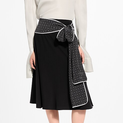 This skirt has sophisticated appeal in silk crepe de chine crafted in a fluid knee-length shape. The waistline is highlighted with a casually knotted silk twill scarf featuring an allover mini Monogram motif in a two-tone print for a graphic signature flourish. It is fastened at the side with an invisible zipper for a clean finish.