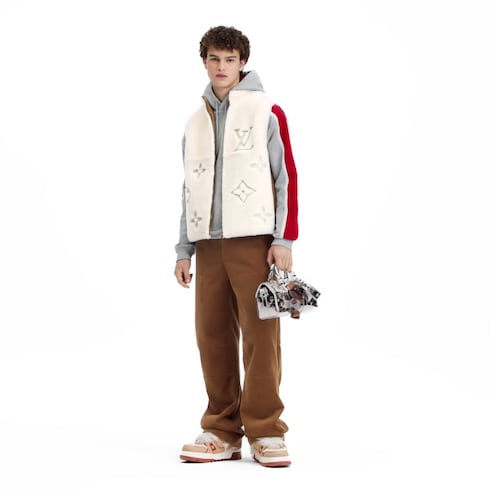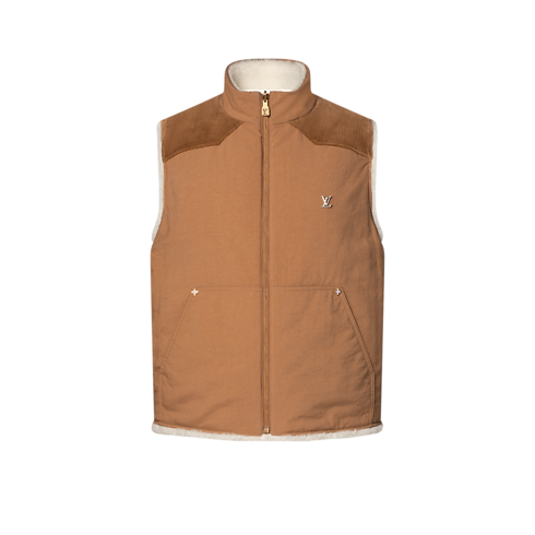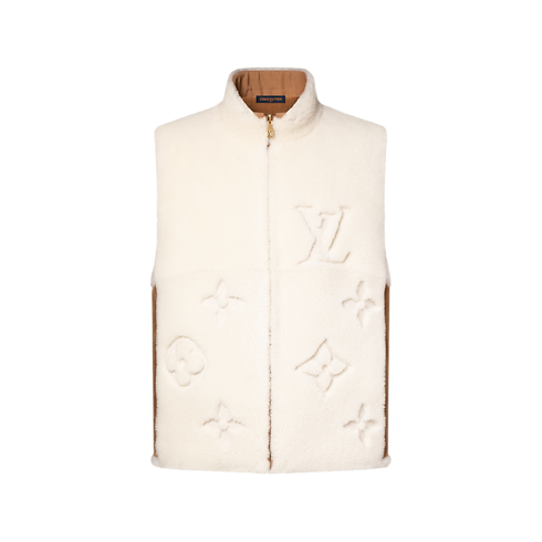 Este colete utilitário reversível em shearling branco é uma peça aconchegante e macia que pode ser usada de várias maneiras. Um Monogram oversized é aplicado no lado em shearling e bordado com efeito de tricô. No verso, o modelo utilitário em canvas e veludo cotelê é valorizado com as LV Initials em metal no peito, rebites de Flor do Monogram e patches exclusivos em couro VVN colorido.
