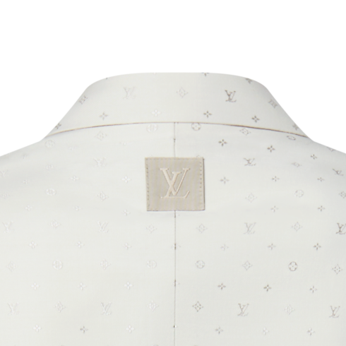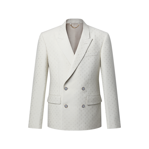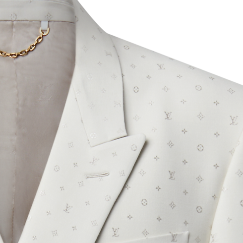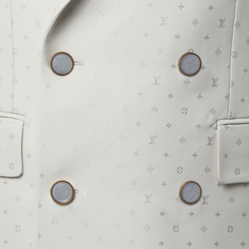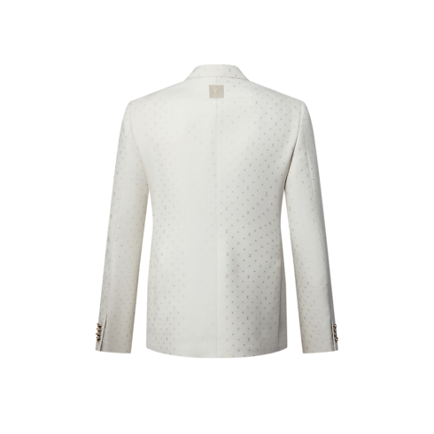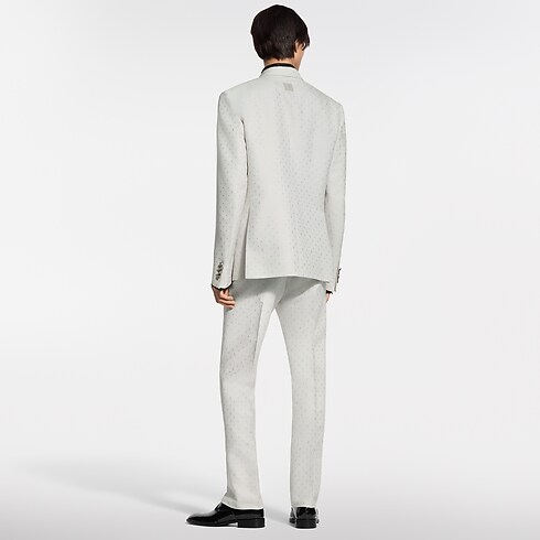 Este elegante blazer trespassado para noite, em um tom suave de marfim, destaca-se em celebrações de verão. Apresenta uma padronagem Spaced Mini Monogram em jacquard tom sobre tom, revelada em um sutil contraste entre texturas matte e lustrosas, graças à composição sofisticada de seda e mohair do tecido. A silhueta elegante — um ícone do estilo dândi — cria um terno impecável quando combinada com a calça correspondente.