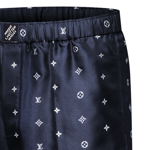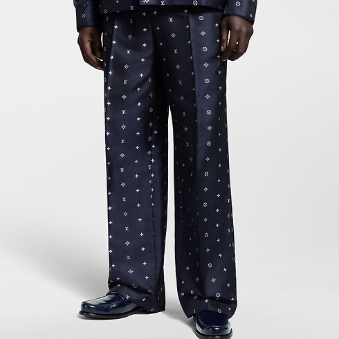 Esta calça de pijama fluida é sofisticada e casual, ideal para eventos noturnos. Confeccionada em seda orgânica azul navy, é decorada com jacquard Spaced Monogram com detalhes brancos contrastantes, enquanto fitas com debrum tom sobre tom destacam as pernas e uma etiqueta Marque L.Vuitton Déposée realça o cós elástico. Uma camisa de pijama combinando compõe um conjunto para noite.