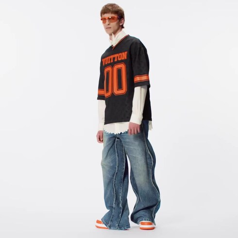 Esta camiseta preta com gola V inspirada no futebol americano é confeccionada em piquet de algodão leve e recoberta com o jacquard Monogram. A peça é estampada com assinaturas Vuitton e listras ousadas em um tom vibrante de laranja para um ar esportivo. Uma etiqueta invertida nas costas dá o toque final.