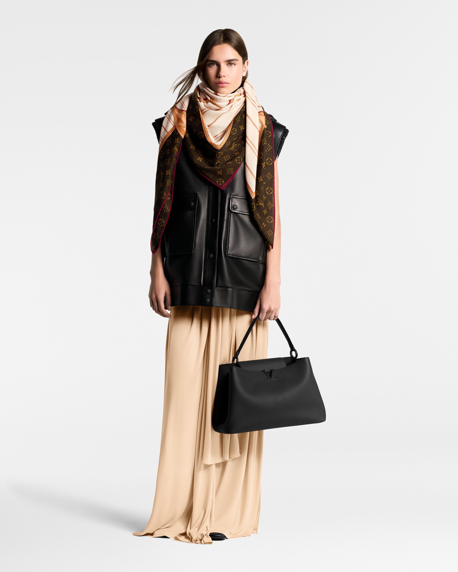 O design marcante e original do xale My Neverfull foi inspirado na icônica e atemporal bolsa Neverfull da Louis Vuitton. Alças e emblemas, incluindo um LV Circle e um cadeado, são estampados sobre o tecido de lã e seda, e um patch icônico, ponto central da peça, remete ao universo de viagens e baús históricos da Maison.