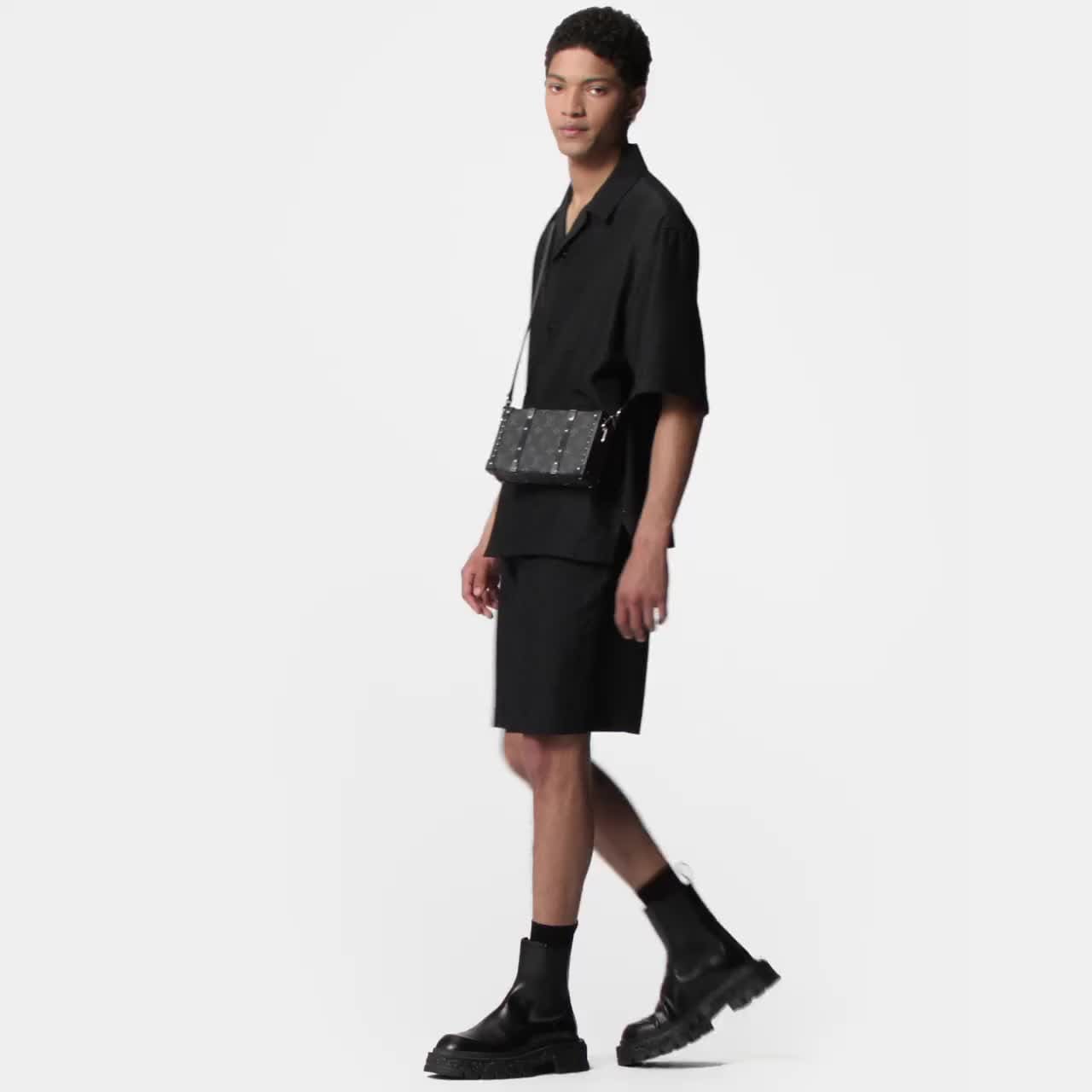 A bolsa Neo Wallet Trunk apresenta vários elementos associados aos baús da Maison, como ripas de madeira e cantos metálicos reforçados. Fácil de carregar graças à alça longa removível, ela traz um interior com espaço suficiente para guardar itens essenciais do dia a dia, como celular, chaves, carteira, cartões e fones.