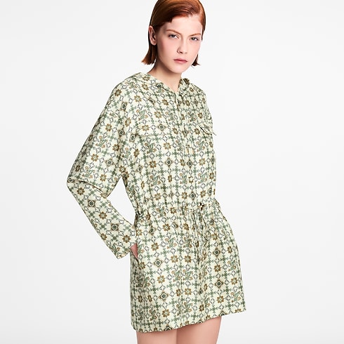 Em homenagem às raízes Art Nouveau da Maison, este vestido chemisier exibe uma sofisticada estampa floral por toda a peça, pontuada por emblemáticas assinaturas Louis Vuitton. Confeccionado em seda leve, com modelagem reta e mangas longas, apresenta bolsos estruturados com aba e um capuz esportivo. O cordão define elegantemente a cintura, com acabamentos chic de Flor do Monogram.