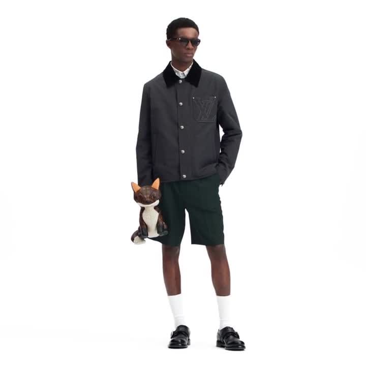 Esta jaqueta utilitária preta, com gola de veludo cotelê elegante, é uma peça atemporal para todas as estações, apresentando corpo em nylon repelente à água e forro matelassado. A silhueta minimalista é realçada pelo LV bordado no bolso do peito e pelo patch em couro Marque L.Vuitton Déposée nas costas. A pala com botão de pressão sobre o zíper acentua a elegância funcional deste item.