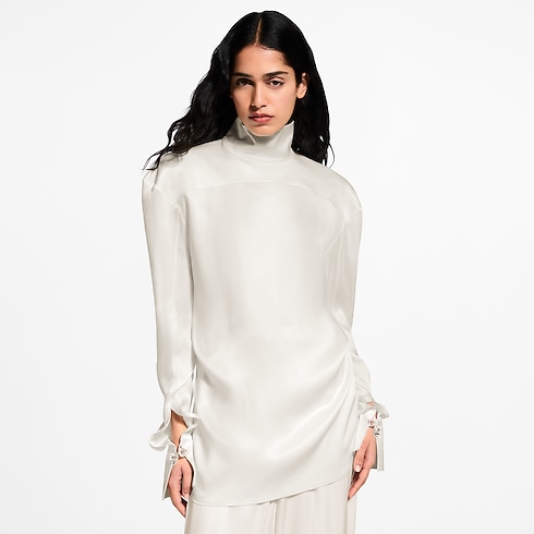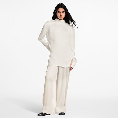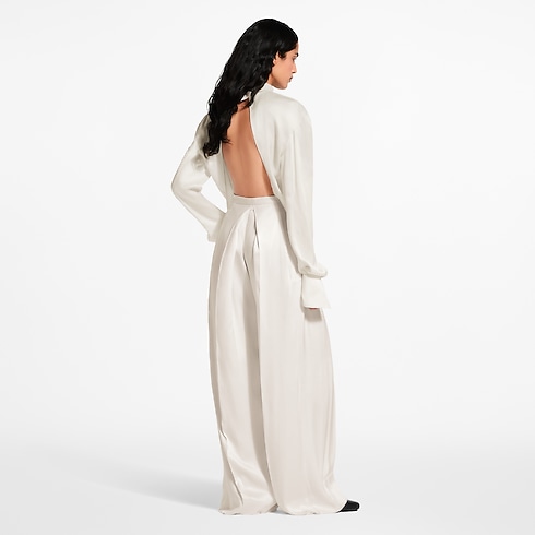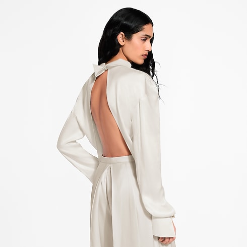 Graphic lines elevate this blouse from the runway collection into a sophisticated statement. It is crafted from fluid silk twill in a sharp straight cut complete with pronounced shoulders and a high-neck collar, while the back is completely revealed with a sweeping cut-out across the shoulders. Monogram Flower cufflinks complete the look with an elegant signature accent.
