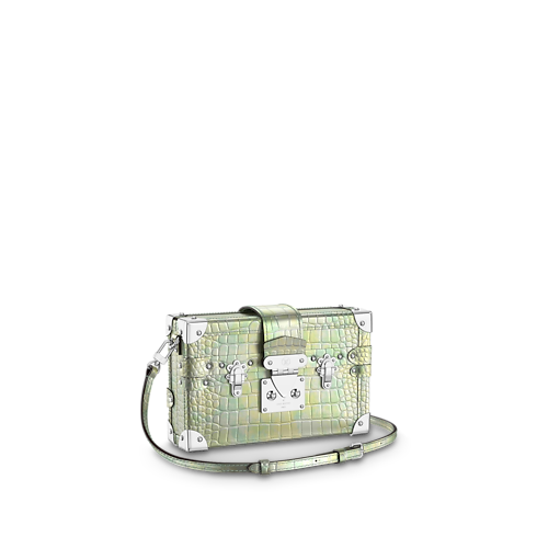 Nicolas Ghesquière repaginou os elementos icônicos dos baús históricos da Maison na refinada bolsa Petite Malle. Feito no nobre couro croco, este cobiçado "pequeno baú” transita elegantemente entre dia e noite. Entre verdes claros e escuros, tonalidades claras criam um efeito de névoa no couro. O acabamento é valorizado por uma camada prateada sutil, visível dependendo da luz e do ângulo.