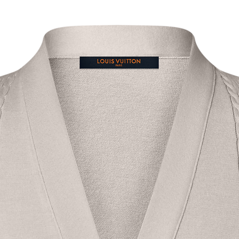 Este elegante cardigã marfim é uma peça versátil para sobreposição no guarda-roupa formal moderno. Confeccionado em uma sofisticada mescla de algodão e seda, apresenta um leve e arejado tricô de malha perfurada, trazendo faixas tom sobre tom dos icônicos Monogram e Damier. Unindo conforto à elegância preppy, pode ser usado com um terno ou combinado com uma calça chino para um visual refinado e contemporâneo.
