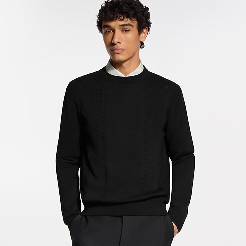 Este suéter preto chic de manga longa é confeccionado em um sofisticado fio de algodão e seda, com delicadas assinaturas Monogram e Damier em malha perfurada. Finalizado com bordado exclusivo acima da barra esquerda e um patch de couro LV nas costas, esta peça versátil pode ser usada com um terno ou uma calça chino chic, trazendo um toque contemporâneo à alfaiataria sofisticada.