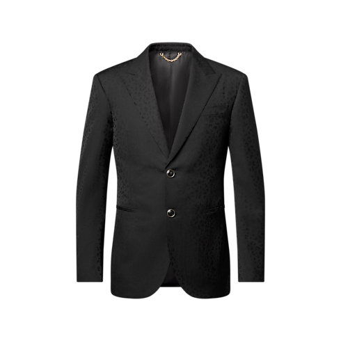 Este elegante paletó preto de abotoamento simples para a noite é ricamente decorado com a padronagem LV Cheetah desta coleção. Interpretada em um sofisticado jacquard acetinado confeccionado com lã de origem responsável, a padronagem gráfica felina integra discretas assinaturas Monogram em um rico contraste de texturas matte e lustrosas. A calça cigarette coordenada cria uma silhueta marcante que se destaca com sofisticação.