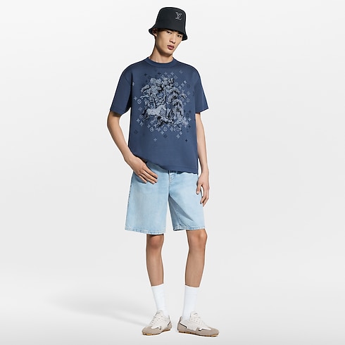 Confeccionado em uma sofisticada mescla de algodão e seda, este suéter de mangas curtas exibe uma padronagem Monogram Horses em jacquard com efeito de tapeçaria. O motivo lúdico, em um azul profundo, apresenta dois cavalos trotando entre árvores, sobre um Monogram em degradê tom sobre tom. Uma intársia Marque L.Vuitton Déposée assina a parte de trás desta peça gráfica.